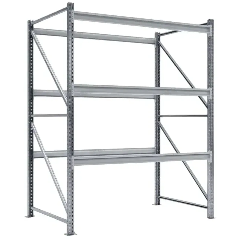 Ригели усилены ребрами жесткости и крепятся к рамам на зацепах, обеспечивая надежную фиксацию и быстрый монтаж. Отсутствие настила упрощает конструкцию, снижает стоимость и расширяет возможности использования стеллажа под различные типы грузов.