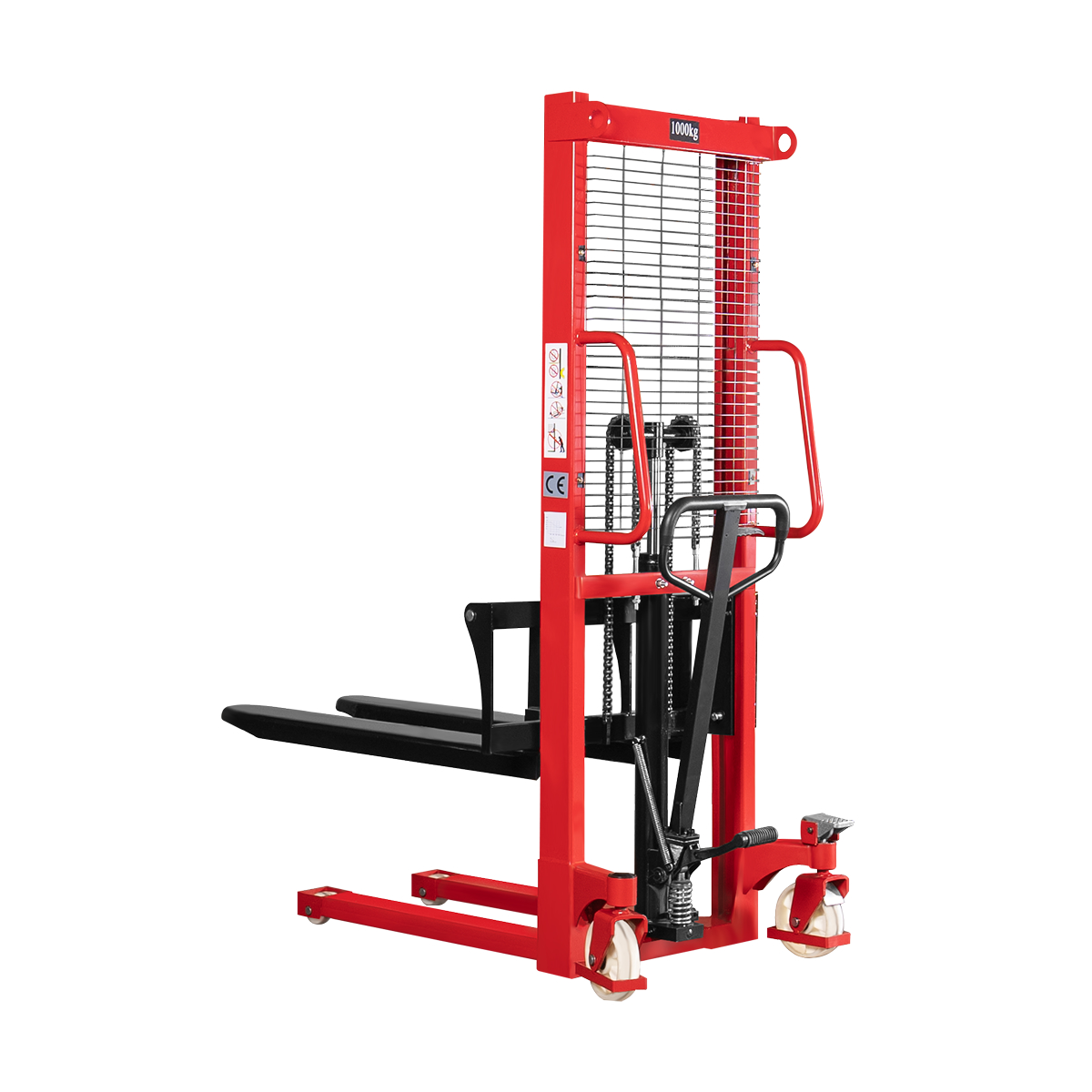 С заботой о безопасности оператора, на штабелере установлена защитная металлическая сетка. С целью повышения комфорта работы, на штабелере имеется курок для опускания вил, педаль для спуска и дополнительная ножная педаль, а рукоять управления имеет прорезиненное покрытие.