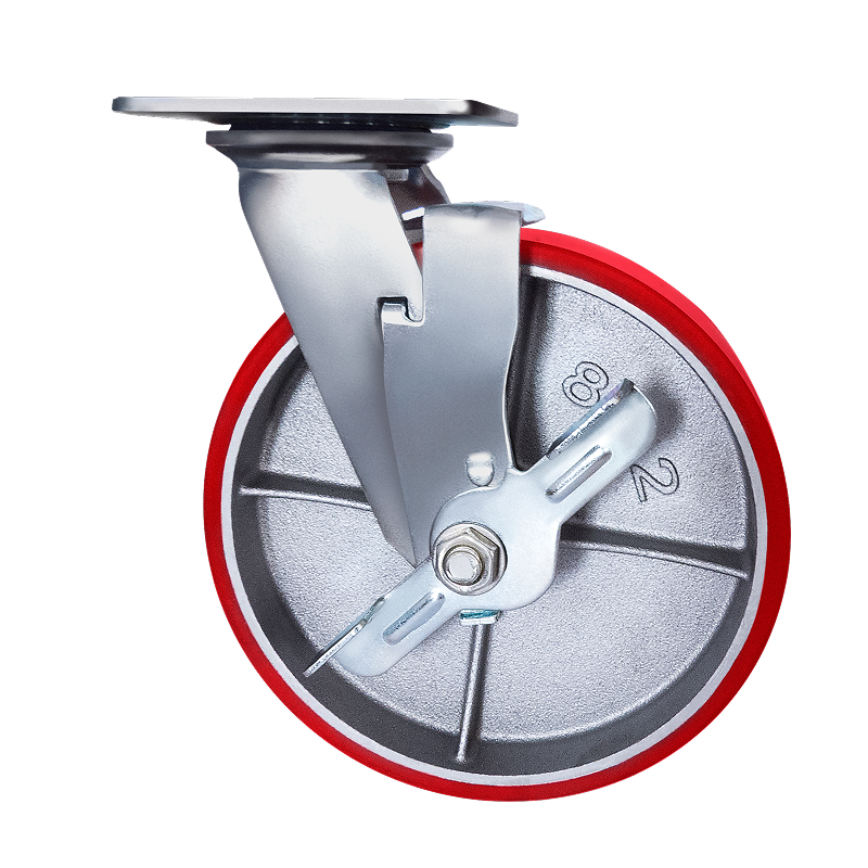 Колесо большегрузное полиуретановое поворотное с тормозом SCPB63 предназначено для оснащения складского, транспортного строительного оборудования и тяжелых механизмов. Шинка выполнена из полиуретана. Материал отличается высокой износостойкостью и большой грузоподъемностью. Колесо отлично переносит динамические, статические и ударные нагрузки, хорошо служит на любых твердых поверхностях. Обод выполнен из чугуна, оснащен роликовым подшипником в оси и смазочным ниппелем. В поворотном механизме установлен двухрядный шариковый подшипник с пресс-масленкой. Кронштейн — сварной, изготовлен из оцинкованной листовой стали. Диапазон температур — от -35ºC до +50ºC.