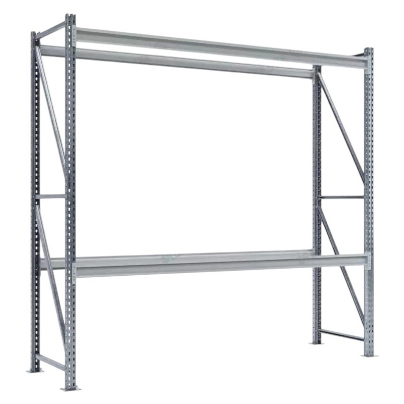 Ригели усилены ребрами жесткости и крепятся к рамам на зацепах, обеспечивая надежную фиксацию и быстрый монтаж. Стеллаж подходит для складов, где требуется вместительное и универсальное решение для хранения крупногабаритных грузов.