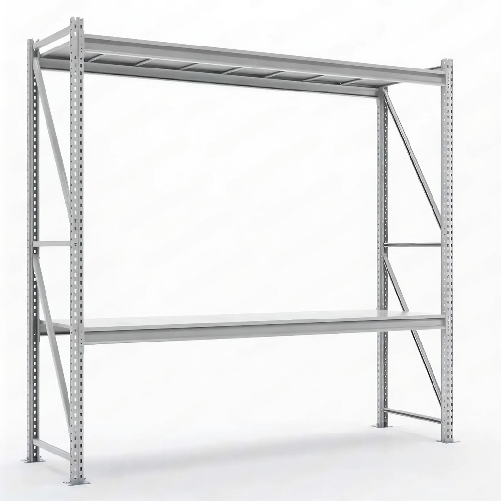 Конфигурация с двумя уровнями обеспечивает быстрый доступ к товару и часто используется в зонах приемки, комплектования и оперативного хранения. Такой железный стеллаж подходит для коробок, инструмента и различных типов грузов.